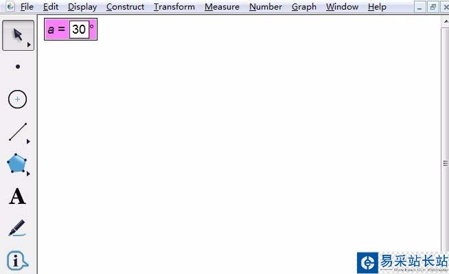 1、新建角度參數a并標記角度。打開幾何畫板,點擊上方菜單欄“數據”菜單,在彈出的下拉菜單選擇“新建參數”命令,在彈出的對話框輸入名稱a,數值30,單位選擇度,點擊“確定”,這樣就建立好了角度參數。選中參數a,執行“變換”——“標記角度”命令。