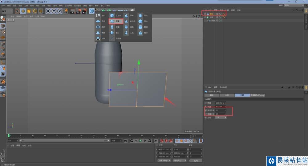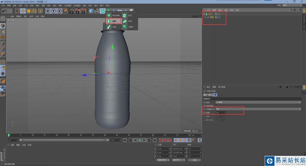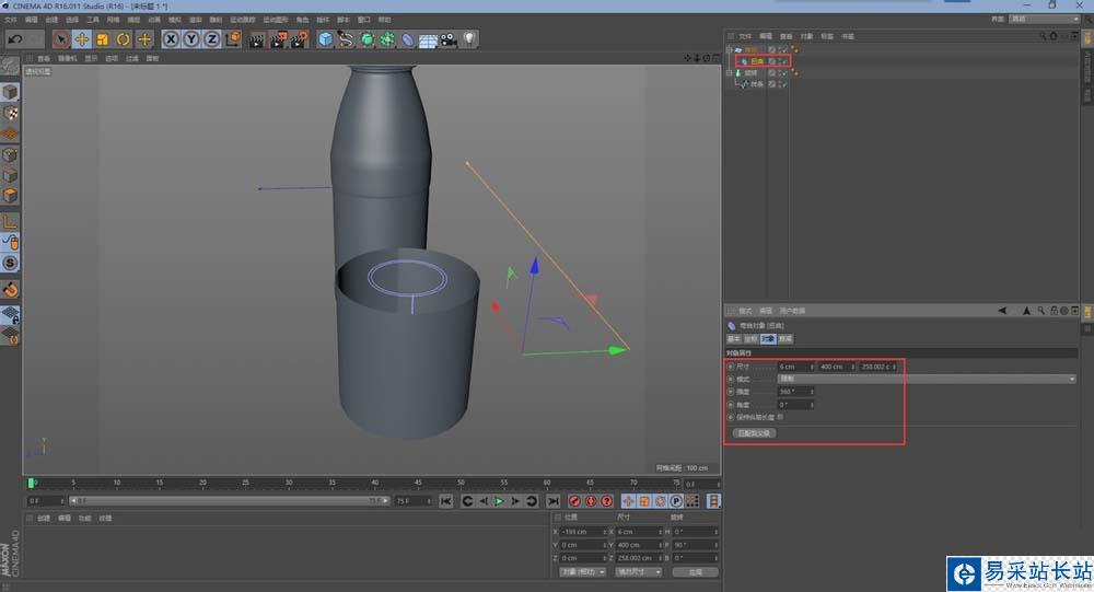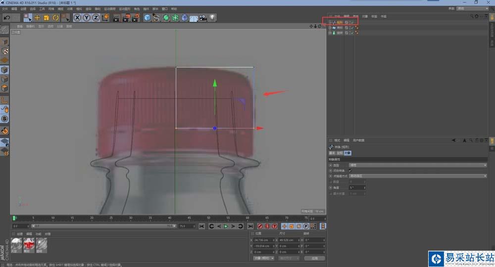6、商標的模型也創(chuàng)建好了,接下來就創(chuàng)建瓶蓋的模型了,這里也是利用旋轉建模來操作的,當然你也可以通過一個圓柱通過拉點調(diào)線來操作。新建一個矩形樣條,將其轉換為可編輯對象,然后只放在瓶蓋的一半位置。