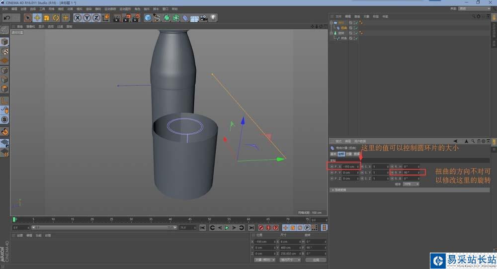 5、這樣礦泉水瓶的大體形狀就出來了,接下來制作貼標簽的模型,我這里采用的是利用一個平面然后使用扭曲變形器作為它的子物體,然后調(diào)整參數(shù)而得到的圓柱的片的效果,然后再調(diào)整到頂視圖對其即可,具體參數(shù)可以看截圖。(這里說一下我為什么不用圓柱去掉封頂來做或者是直接使用管道來進行操作,因為平面更利于貼材質貼圖,其他的操作再貼圖的時候處理比較麻煩)