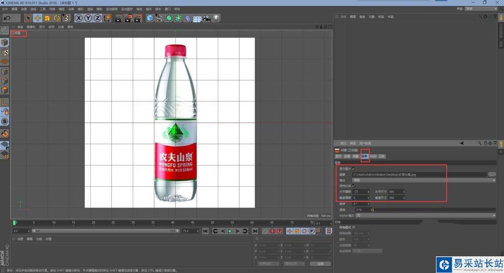 1、首先,將模型的參考圖導入到C4D軟件的正視圖(可以先打開軟件然后調(diào)整到正視圖,將圖片直接拖進去即可),然后按shift+v,將參考圖的信息調(diào)出來,然后利用偏移等將參考圖盡量的居中于視圖,以便做旋轉操作。
