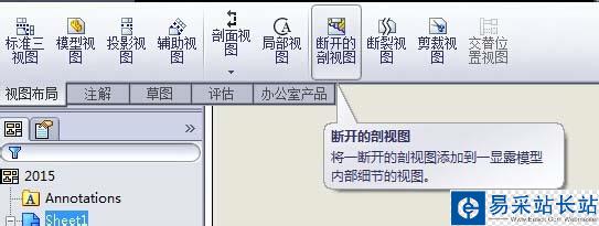 4、在工程圖上菜單欄中找到相應的斷開剖視圖的命令,點擊斷開剖視圖命令,
