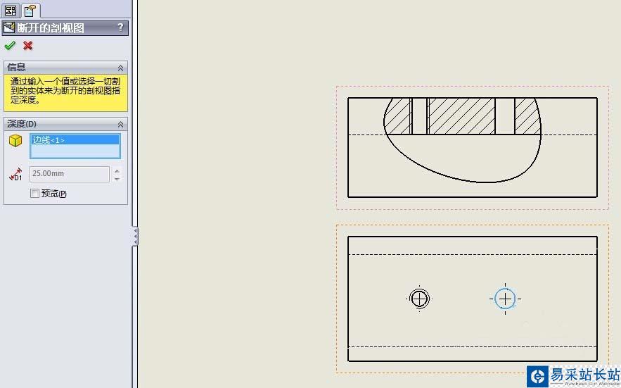 7、兩個方式分別為:參數設置以及對應線條深度參考設置,參數設置為正視圖中零件的外側到孔型的距離(圖中孔在寬度中心上),零件寬為50,對應參數為50/2,然后完成,