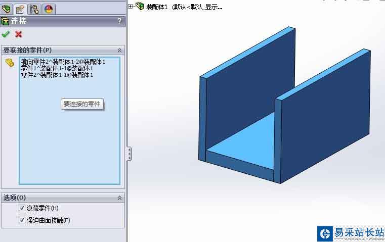 注:下面的兩個選項可以視情況而定,選擇“隱藏零件”會將組合裝配體各零件隱藏,選擇“強迫曲面接觸”一般無影響