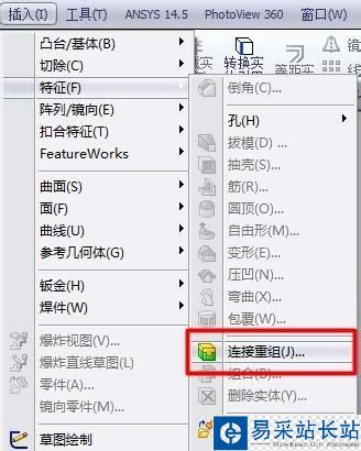 4、不要退出特征編輯狀態,選擇菜單中的插入——特征——連接重組,并選擇需要組合的裝配體,點擊確定,最后退出特征編輯狀態。