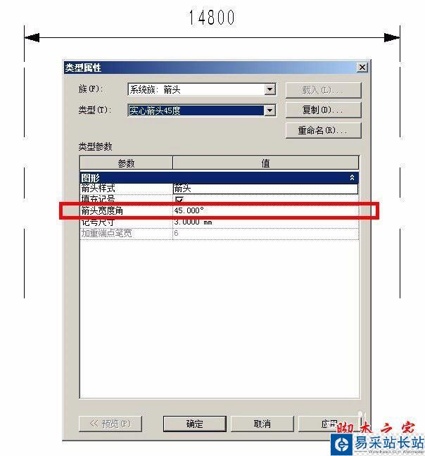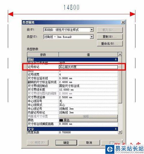 3、即可修改項目中使用該記號標記族的尺寸標注族的記號標記的長度,下圖即為將現行尺寸標注設置為自定義的“實心箭頭45度”時候的情況,對比第一張圖片可查看箭頭角度發生了變化。