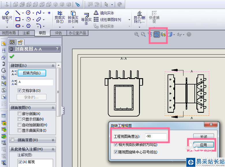 7、可以將剖面視圖改變方向,點擊上面的旋轉(zhuǎn),輸入角度-90,點擊應(yīng)用。剖視圖方向改變。