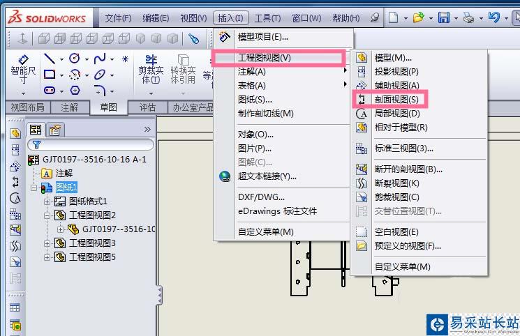2、點擊“插入”,找到“工程圖視圖”,找到“剖面視圖”;