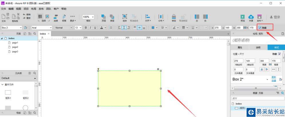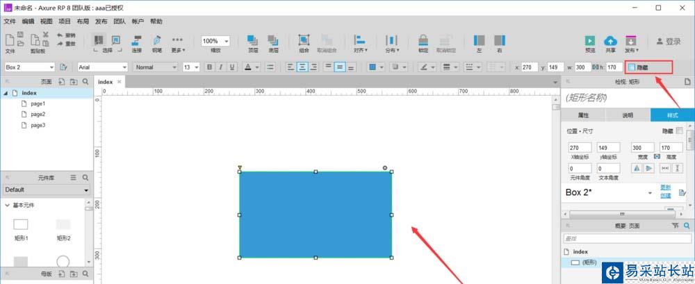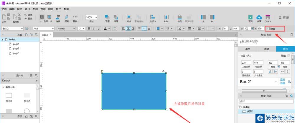 6、順便教大家如何將隱藏的元件再顯示出來,在下圖中右側的概要:頁面中點擊我們隱藏掉的元件,在畫布中將出現隱藏的元件,然后去掉右上角“隱藏”的勾選。