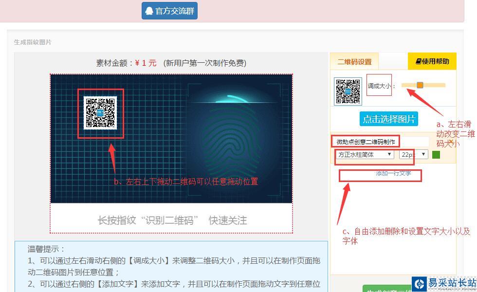 步驟二、點擊【開始制作】按鈕,進入二維碼替換頁面,選擇右側的上傳圖片按鈕;并且上傳完圖片后可以自由的修改參數來進行二維碼的大小和位置的改變,以及自由的添加文字。