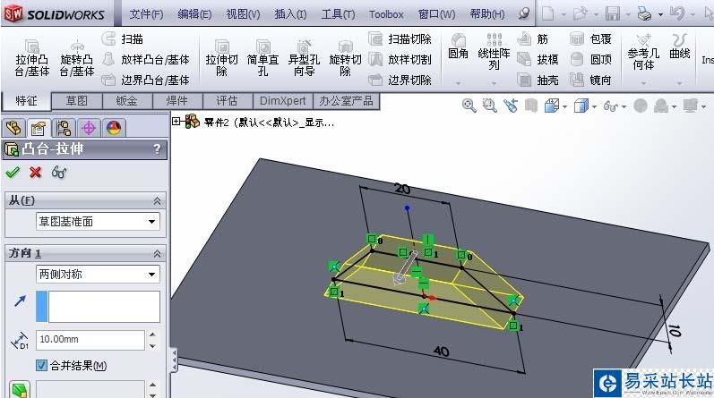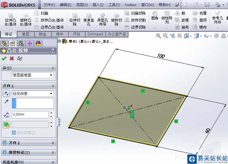 3、創建自己的成形工具特征,我們在“特征模塊“,前視基準面拉伸一個100x60xt2.0的長方體