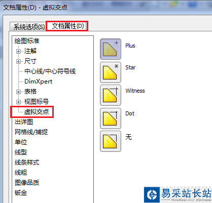 4、我們還可以設置虛擬交點的樣式,方法是選擇菜單欄的選項,在彈出的窗口中選擇文檔屬性選項卡的虛擬交點選項,選擇自己喜歡的樣式保存即可,如下圖所示