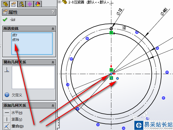 6、選取移動的陣列中心和目標陣列中心,添加“重合”約束條件。