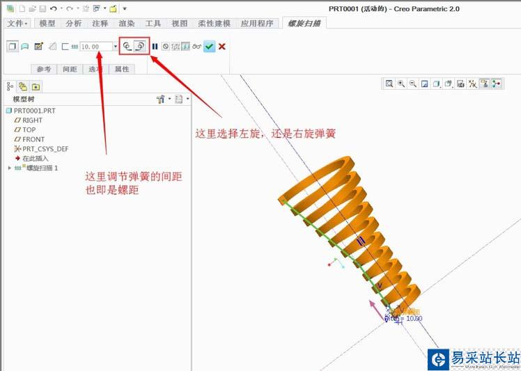 8、點(diǎn)確定后,如果你畫的截面高度比螺距小,將會(huì)出現(xiàn)彈簧的預(yù)覽圖。可以設(shè)置彈簧的間距參數(shù),間距一定要大于截面高度才能生成彈簧。可以設(shè)置左右旋彈簧,默認(rèn)是右旋彈簧。