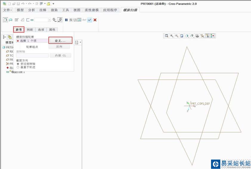3、進(jìn)入到螺旋掃描的操作界面,點(diǎn)開參考菜單,按下圖指示點(diǎn)擊定義,選擇一個(gè)基準(zhǔn)面作為繪圖平面,其它默認(rèn)設(shè)置。