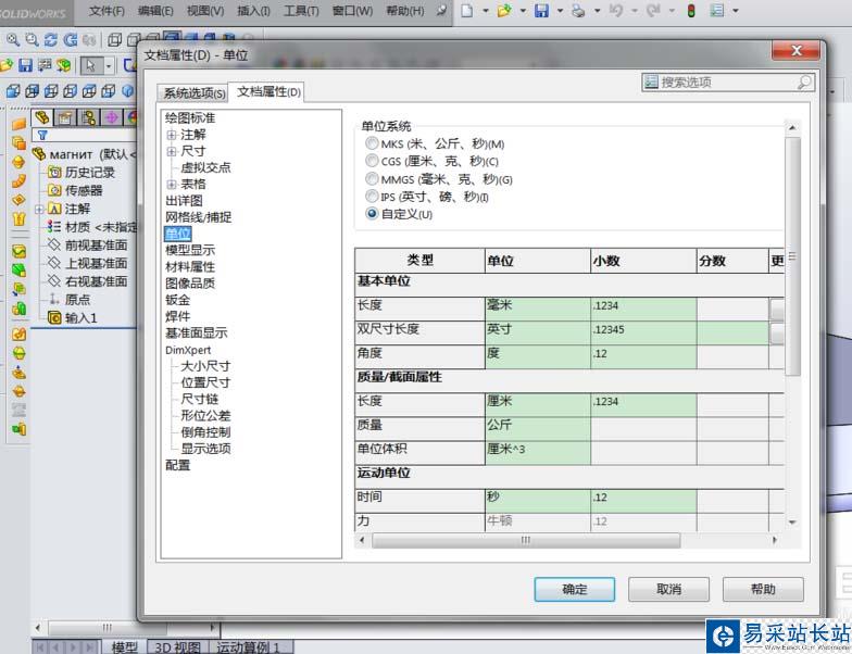 4、選中旁邊的“文檔屬性”,點(diǎn)擊“單位”,跳出以下界面,修改里面的單位系統(tǒng)即可