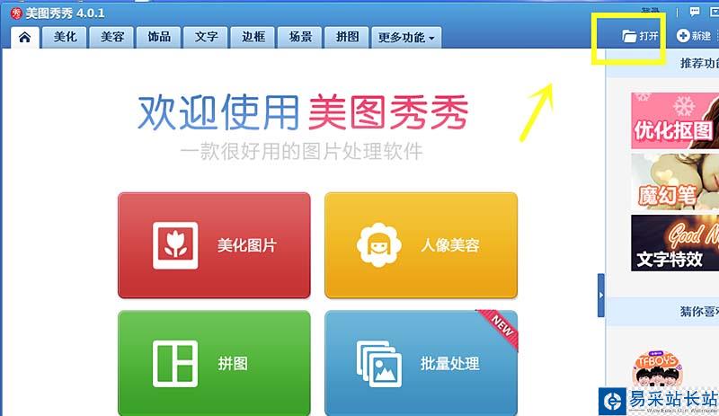 2、在美圖秀秀操作頁面上,點擊“打開”。出現(xiàn)打開一張圖片的對話框。