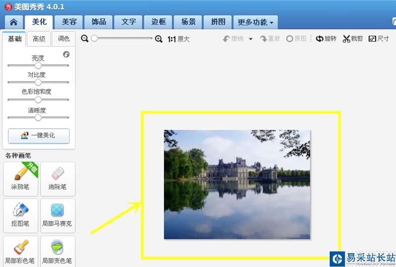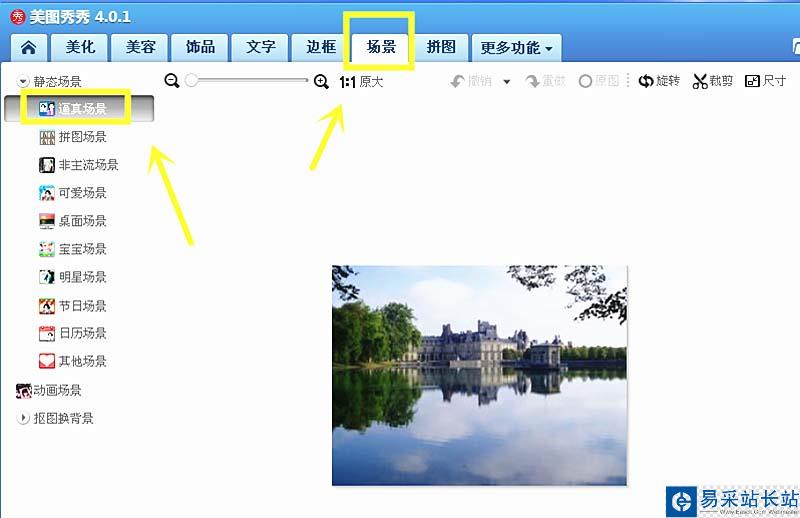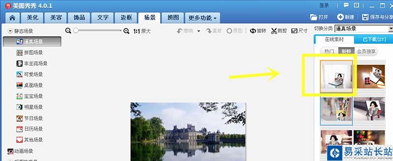 4、在美圖秀秀的操作頁面中出現(xiàn)圖片。點擊場景,再點擊靜態(tài)場景下的逼真場景。