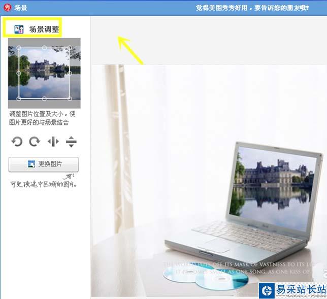 6、圖片顯示在素材的電腦顯示屏中。在場景調(diào)整中,調(diào)整圖片的位置和大小。把圖片和場景結(jié)合好后,點擊確定。