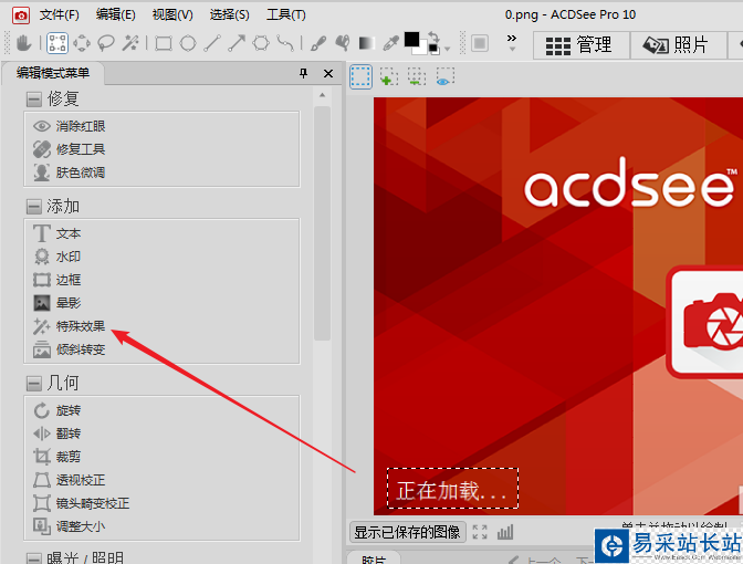 4、使用acdsee為圖片添加選區以后在左側可以看到一系列的功能,我們選擇acdsee的特殊效果。