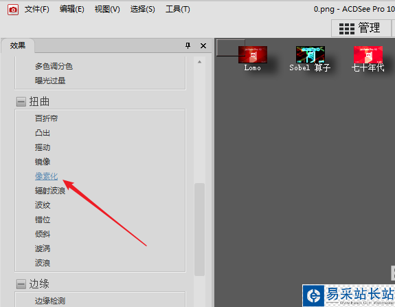 5、在acdsee看圖軟件的特殊效果中我們找到扭曲功能,其中有像素化功能,熟悉ps的朋友基本都知道,acdsee自身的編輯功能也相當的強大。