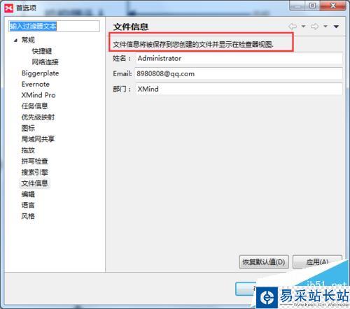 注釋:所填寫的文件信息將會被保存到我們創建的文件中,并且可以顯示在檢查器視圖中。如果想要取消文件信息,只要點擊恢復默認值就會回到XMind默認狀態。