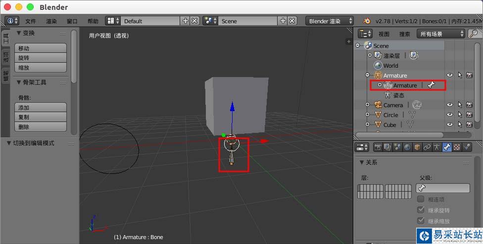 8、如果沒有勾選“線框”,圓環(huán)可能不顯示,我們可以在右邊的場(chǎng)景中進(jìn)行選中,然后在骨骼中勾選線框。