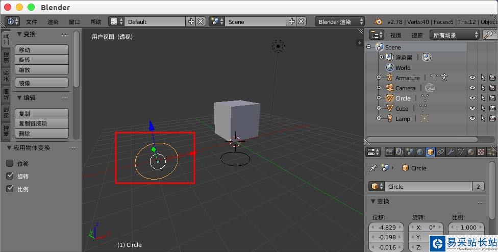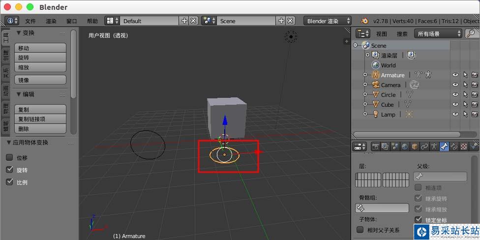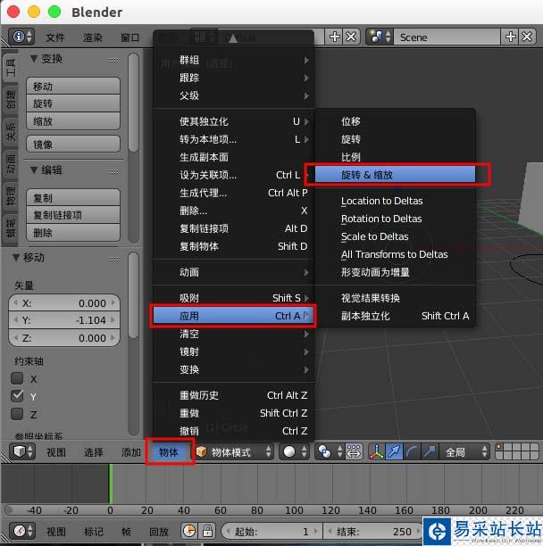 7、然后我們?cè)?ldquo;物體”--“應(yīng)用”--“旋轉(zhuǎn)&縮放”,這樣我們自定義骨骼圓環(huán)顯示的方向就改變了。