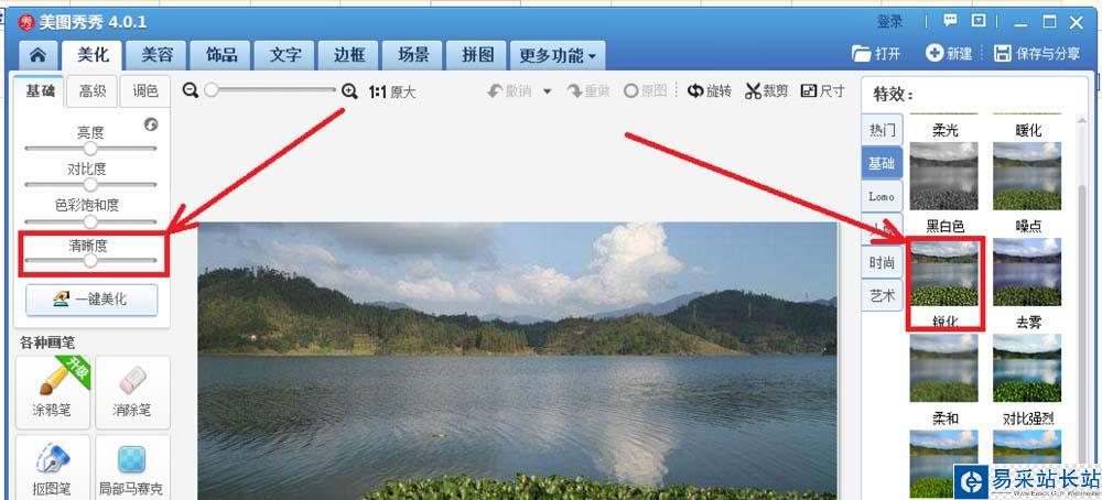 2、調節“清晰度”,并添加“銳化”特效,讓模糊照片輕松變清晰。