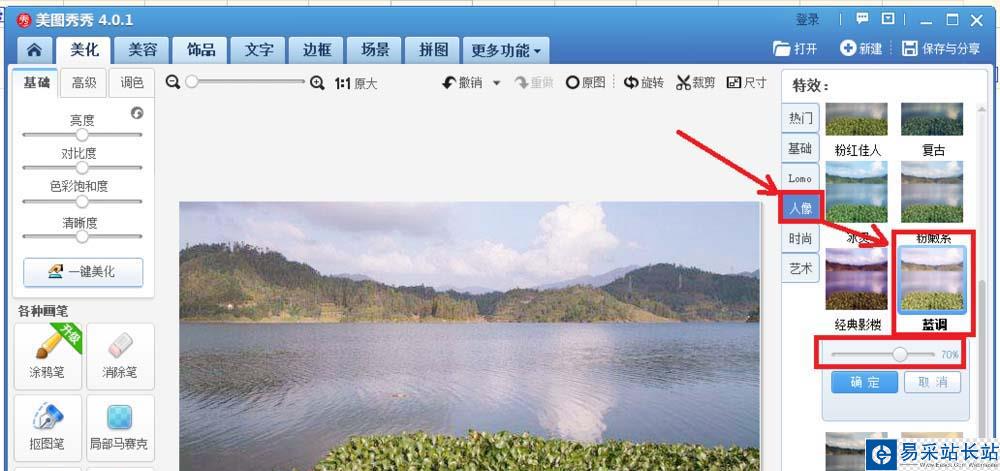 3、為了讓圖片色調的意境更加優美,再添加一個“藍調”特效,并將特效的透明度調至25%,這樣的色調會更自然。