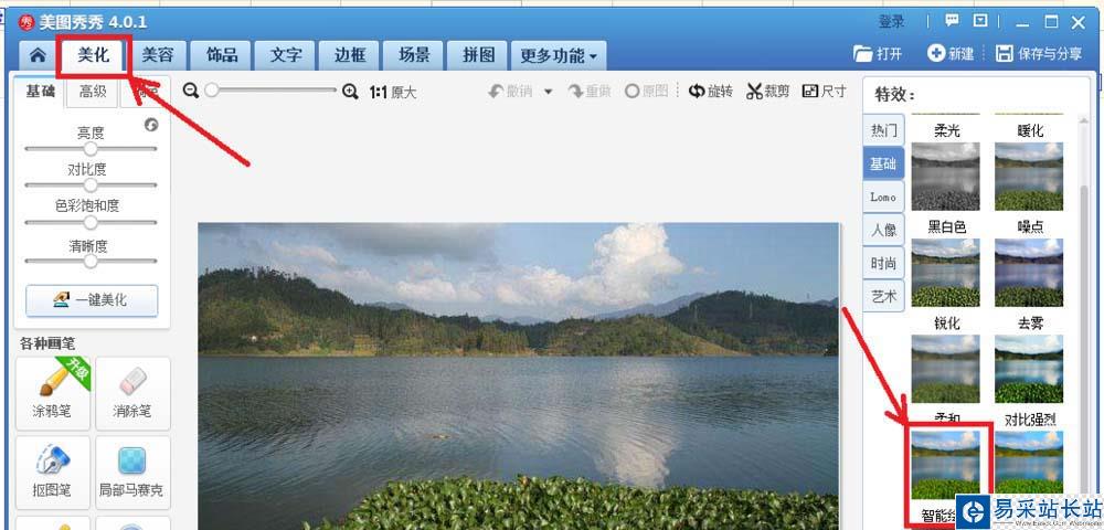1、在“美圖秀秀”軟件下,打開一張照片,在“美化”菜單下,選擇基礎分類下的“智能繪色”特效。