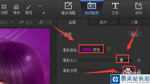 6、點擊數碼暗房選項,在其內找到暈影選項,在暈影選項的設置里,設置參數如圖所示: