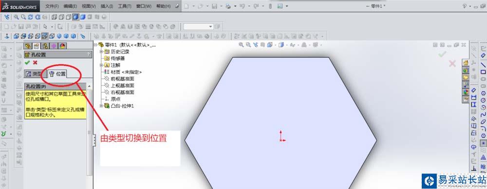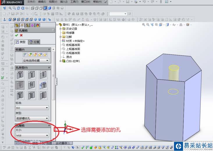 4、以六角鋼的頂面中心點為需要添加螺紋孔點,添加螺紋孔,先正視端面,然后點擊菜單欄上“插入”-“特征”-“孔”-“向?qū)?rdquo;,如下圖