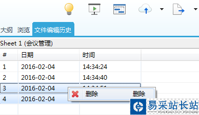 2、文件編輯歷史將出現在畫布右上方,選中多余的歷史版本(即歷史修改記錄),右擊,點擊刪除。