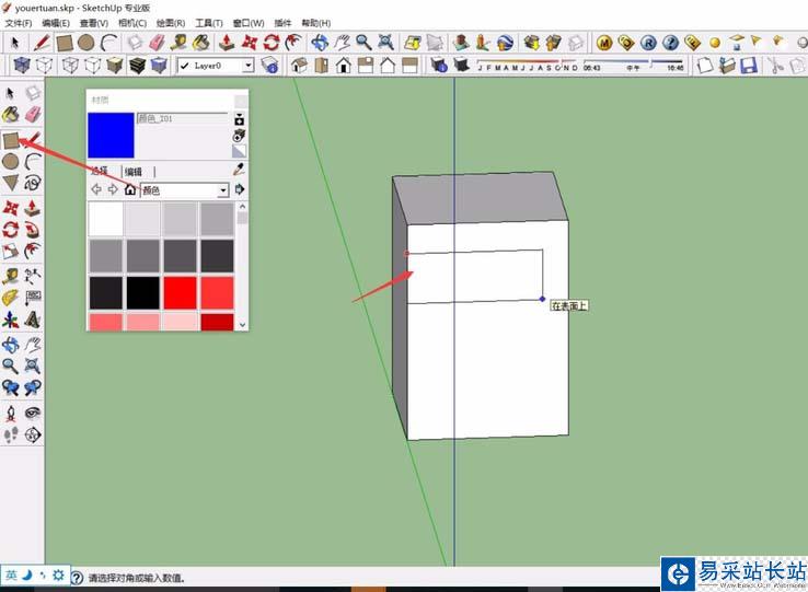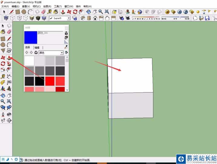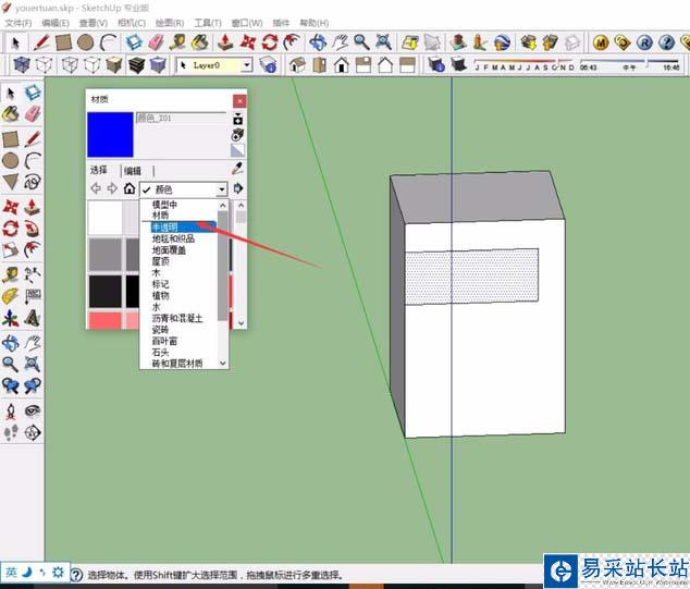 6、確定體塊以及窗戶的大小位置之后,即可進行材質的填充,點擊SketchUp左側的“材質”命令,系統會自動彈出材質的小窗口,我們可以選擇合適的材質和顏色。
