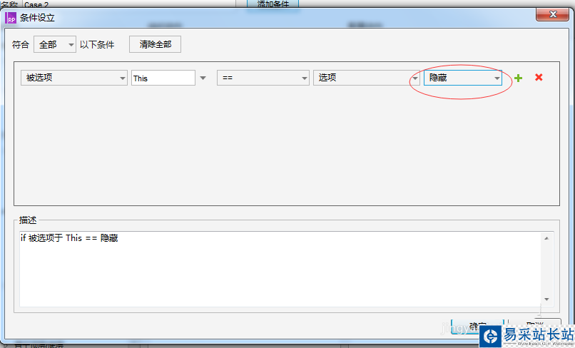 8、參照第六步,再次增加用例2,條件中設置當下拉框的值等于“隱藏”時,如下效果圖所示,點擊確定退出“條件設立”對話框。