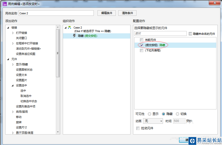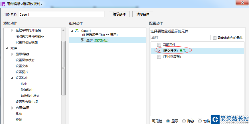 7、條件配置好后,點確定關閉“條件設立”對話框,然后在條件中增加用例,如下圖截圖中設置,目的是實現(xiàn)當下拉框選項選中為“顯示”時,提交按鈕就顯示。點擊確定退出用例1 的編輯。