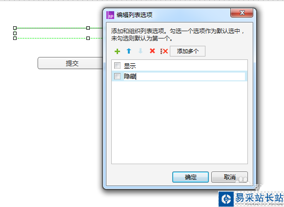 4、雙擊下拉列表框,彈出編輯列表選項對話框,在對話框中添加2個列表選項,我這只是為了演示效果,隨便增加了一些,實際開發(fā)過程中請根據(jù)項目需求添加列表選項。