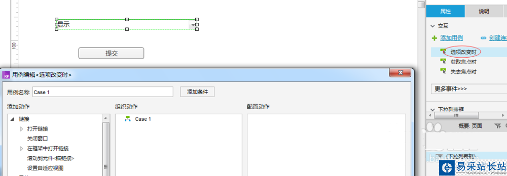 5、選中下拉列表框,雙擊右側(cè)視圖中的“選項改變時”用例,會彈出“用例編輯”窗口,為下拉框增加用例。如下圖所示。