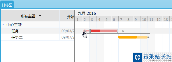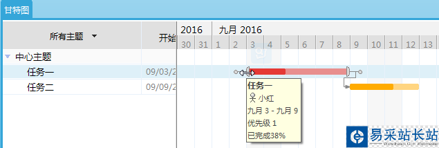 1、調整日期。選中一個任務條,我們可以通過左右移動來調整這個任務的起始日期/截至日期。但這個操作不會改變這個任務的總時長。