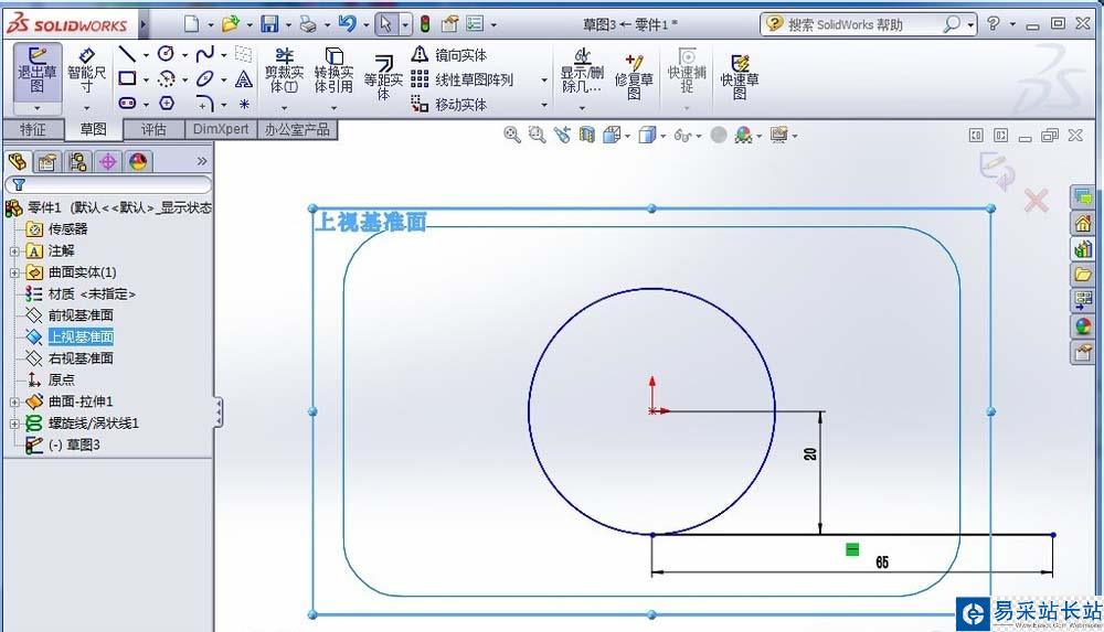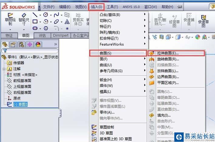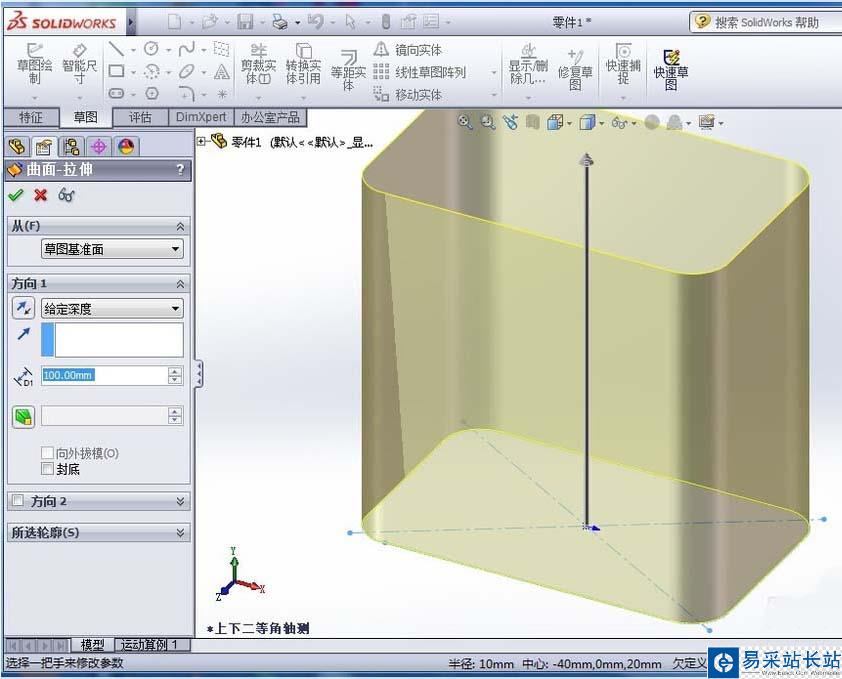 3、依次點擊“插入”——“曲面”——“拉伸曲面”,選擇上一步所畫草圖進行拉伸,拉伸時深度設定為彈簧軸向長度即可;