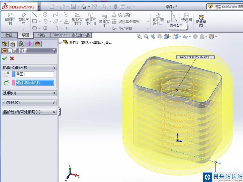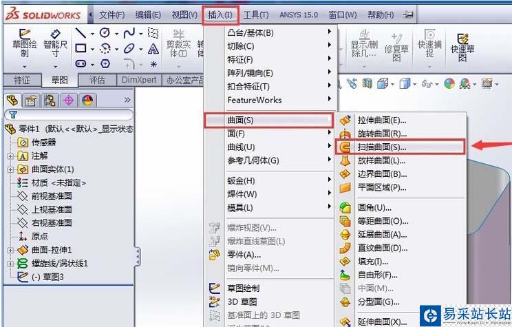 7、依次點擊“插入”——“曲面”——“掃描曲面”,選上一步做所直線為輪廓,之前所做螺旋線為路徑,建立一個螺旋面;