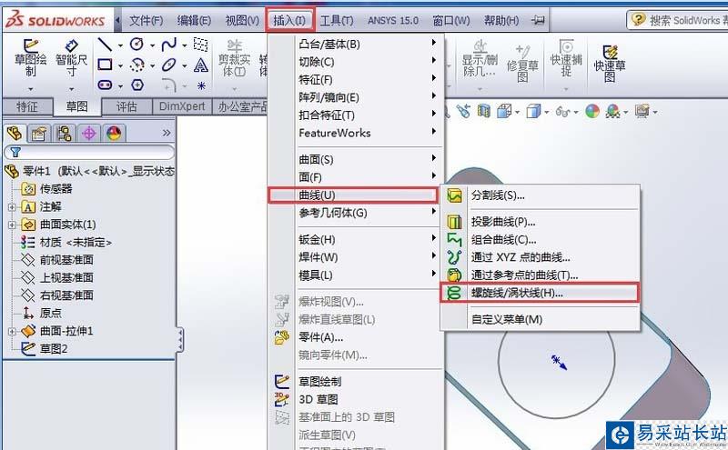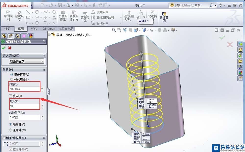 5、依次點擊“插入”——“曲線”——“螺旋線/渦狀線”,選取上一步畫的圓開始建立螺旋線,設定好螺距、圈數(shù)等參數(shù);