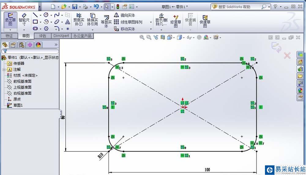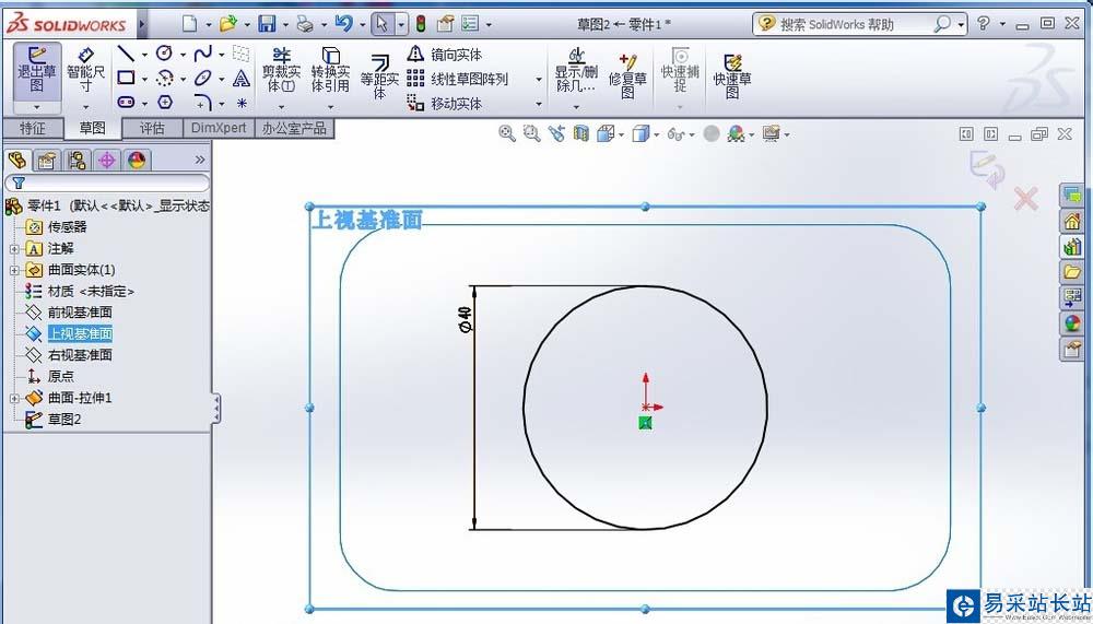 1、在上視基準面建立矩形草圖,確定好尺寸并進行倒圓;