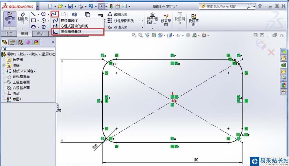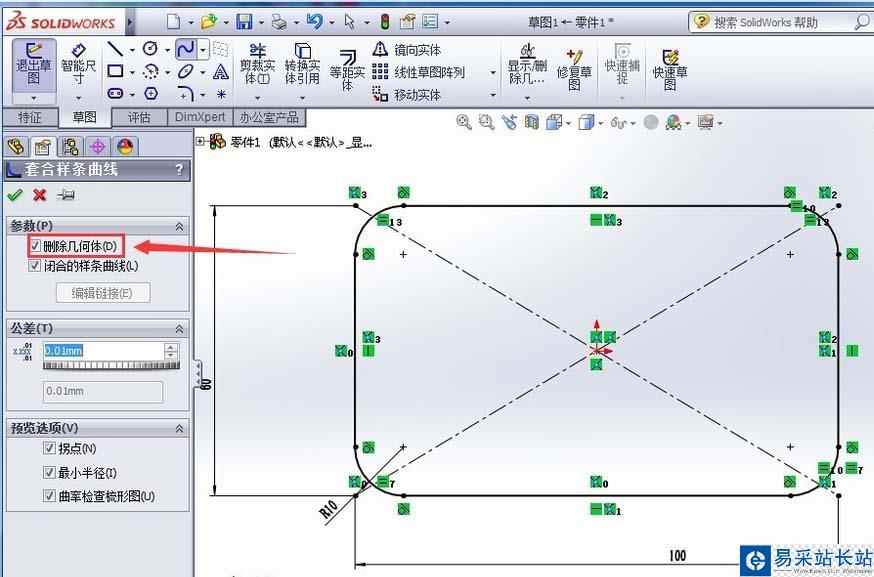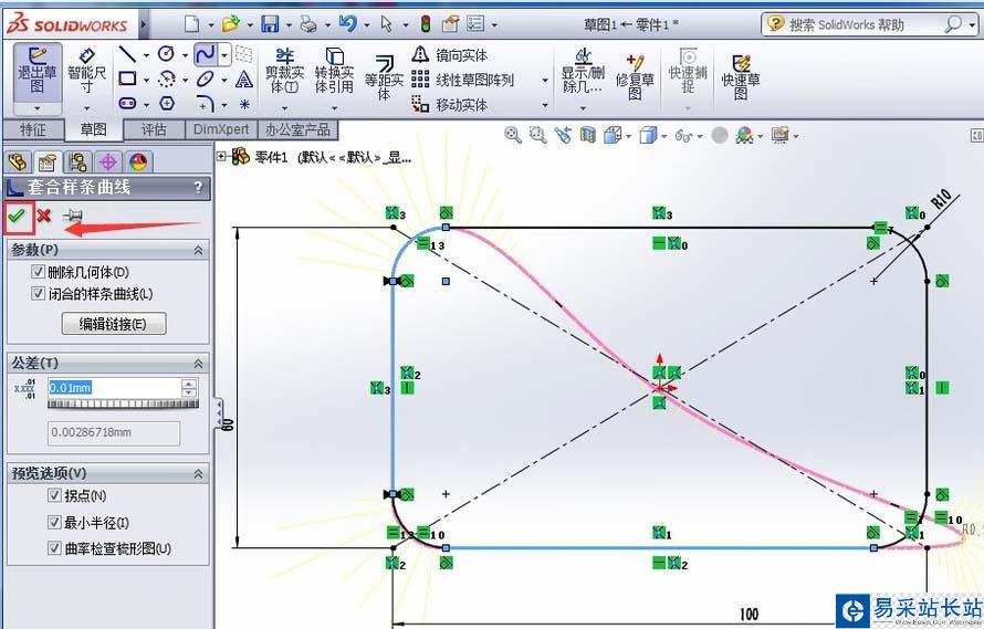 2、點擊“樣條曲線”里面的“套合樣條曲線”,勾選“刪除幾何體”,然后用鼠標依次點擊草圖中的所有線段,然后確定并退出草圖。這一步操作是將所畫草圖構成連續(xù)的曲線,為之后的連續(xù)曲面做準備;