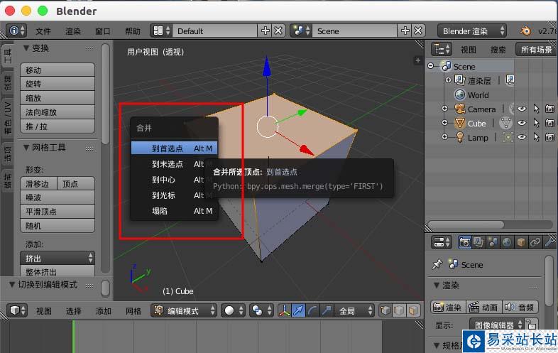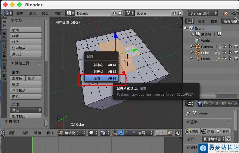 7、然后alt+m選擇“到光標”,我們發現選中的頂點都合并到光標的位置了。