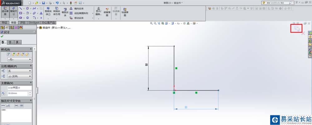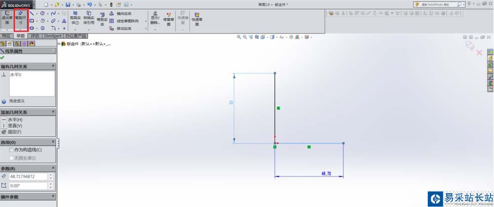 6、草圖尺寸定義:單擊智能尺寸,編輯直線長度。(光標定位在需要編輯尺寸的直線上,單擊拖動鼠標,更改長度后單擊“√”)