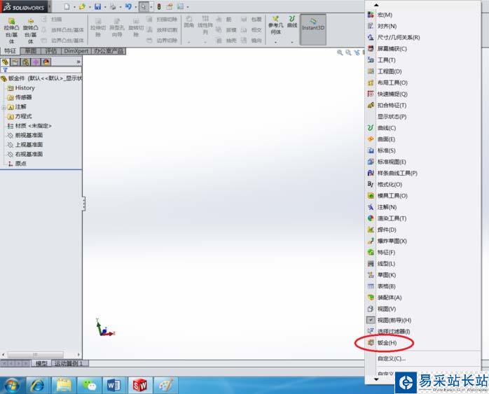 2、調出鈑金命令欄:將鼠標光標定位在工具欄并右鍵單擊,界面會自動跳出工具選擇。單擊向下按鈕,找到鈑金,左鍵單擊鈑金,界面自動跳出鈑金工具欄。