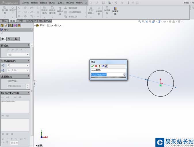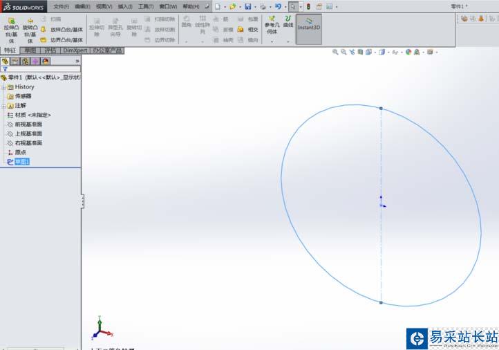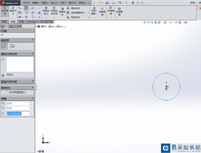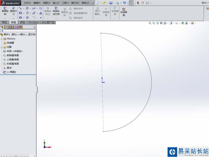 4、草圖定義:進入草圖界面后,選擇圓工具,在界面繪制圓,然后用剪刀剪切半圓即可,選擇智能尺寸編輯圖形的大小,完成草圖后退出。