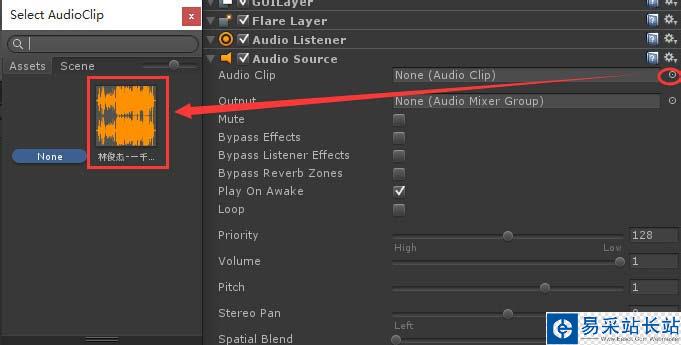 4、回到Inspector視圖中,點擊“Audio Source”,在出現的下拉框中點擊“Audio Clip”標簽對應的圓圈。
