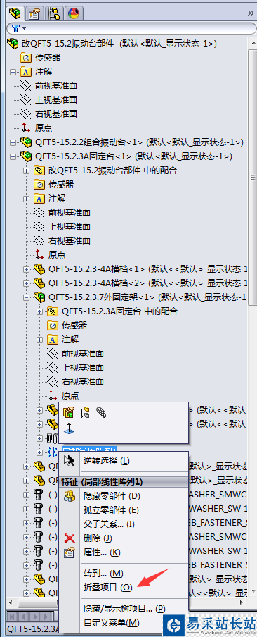 2、這時,我們只需要在模型樹中隨便(是的,是隨便,在最高級的總裝圖,或者其他子級的零件圖,或者零件圖的特征操作處,甚至是最底部的空白區)的位置右鍵,在跳出的對話框中選擇“折疊項目”;